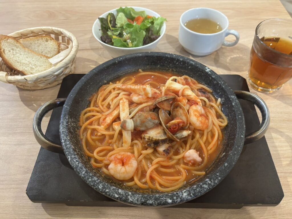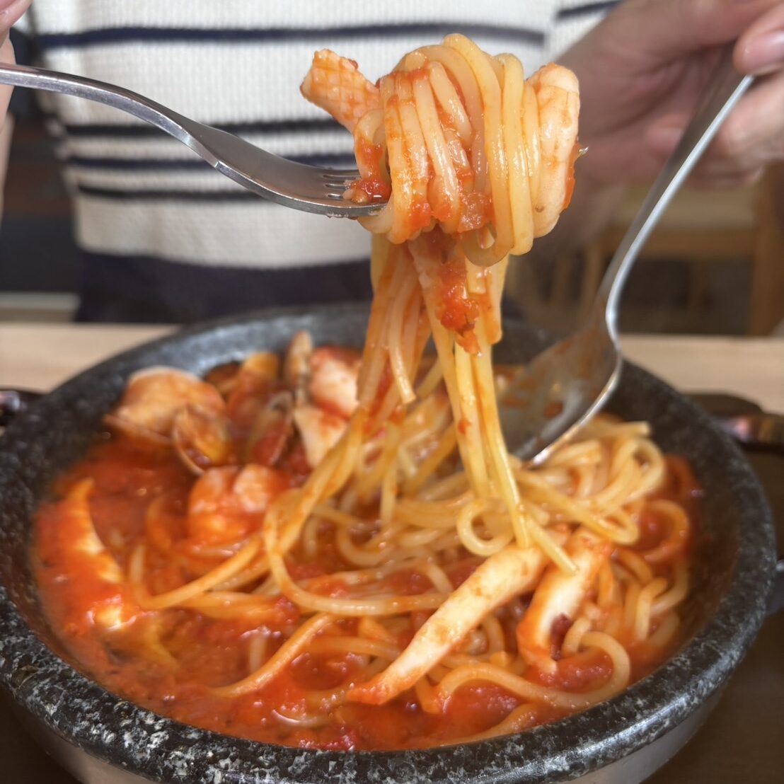 ここでは、トマトベースの魚介パスタ=ペスカトーレを、石焼き仕上げで贅沢に楽しめます。